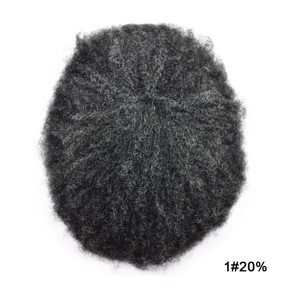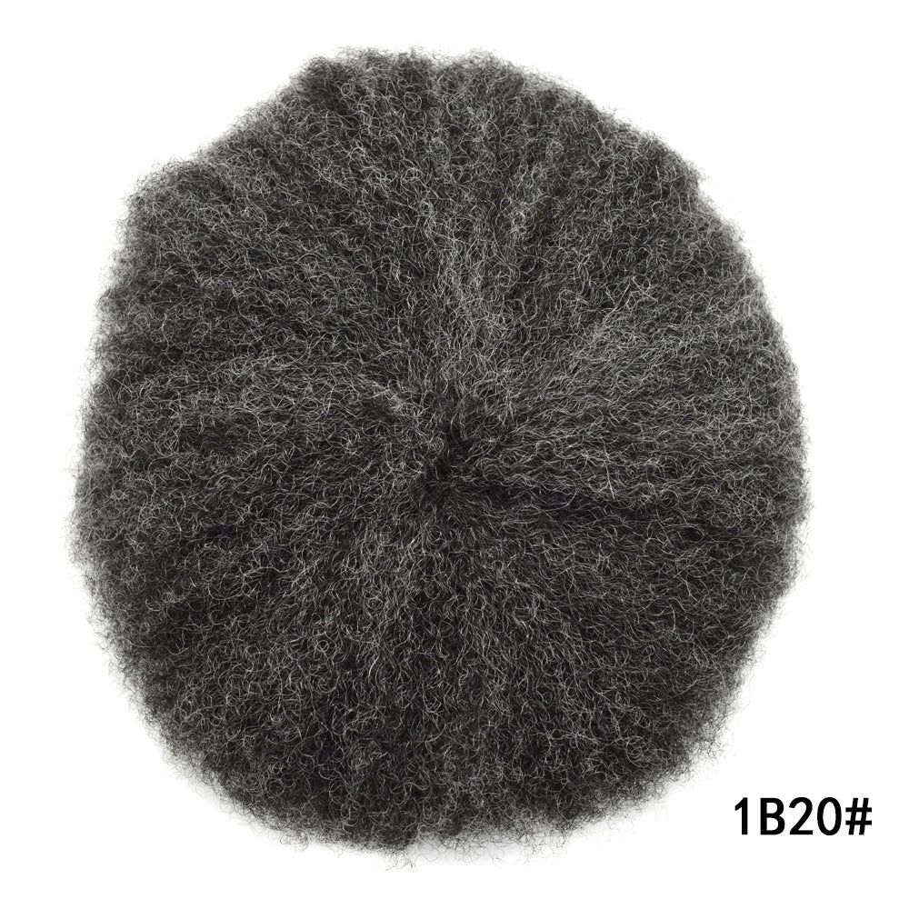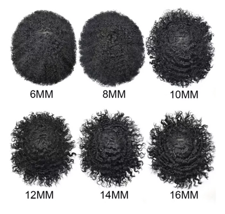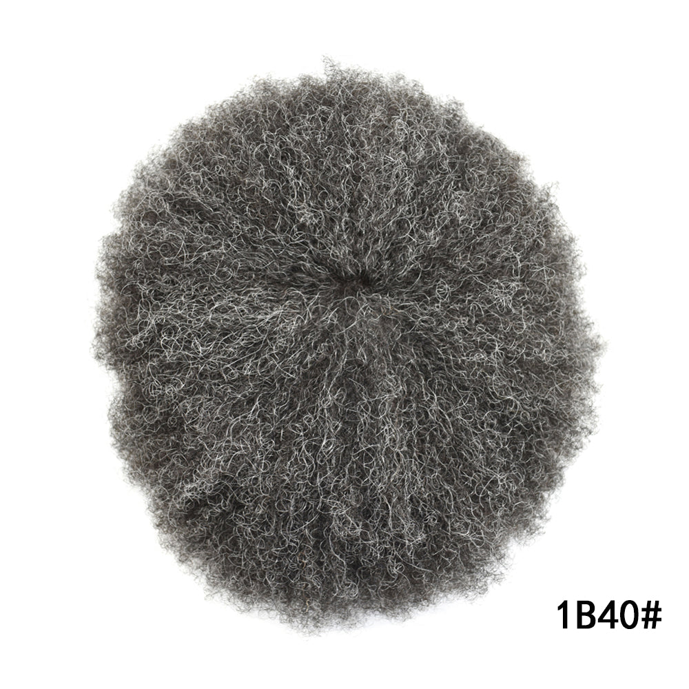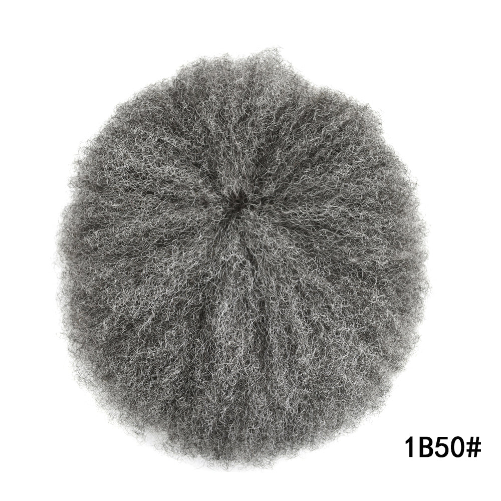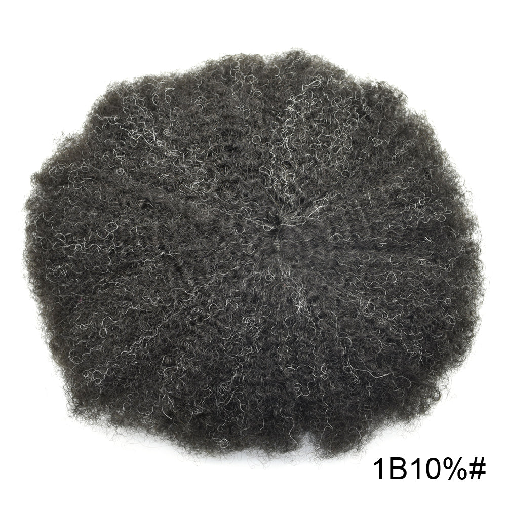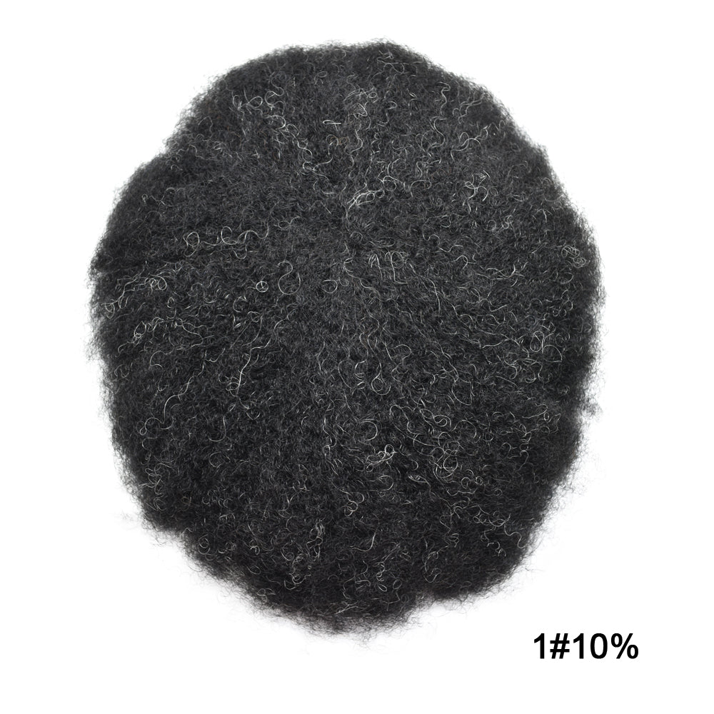 【Afro Hair System Color Density】Afro curly hair piece for black men 4mm 6mm 8mm 10mm 12mm 14mm 16mm 20mm.Mens toupee hair available color:Black,Brown,Ash Grey and Light Blonde.Mens hair toupee white gray hair is synthetic fiber.60RY# is All gray human hair.Afro hair system density is 120% medium light to medium density