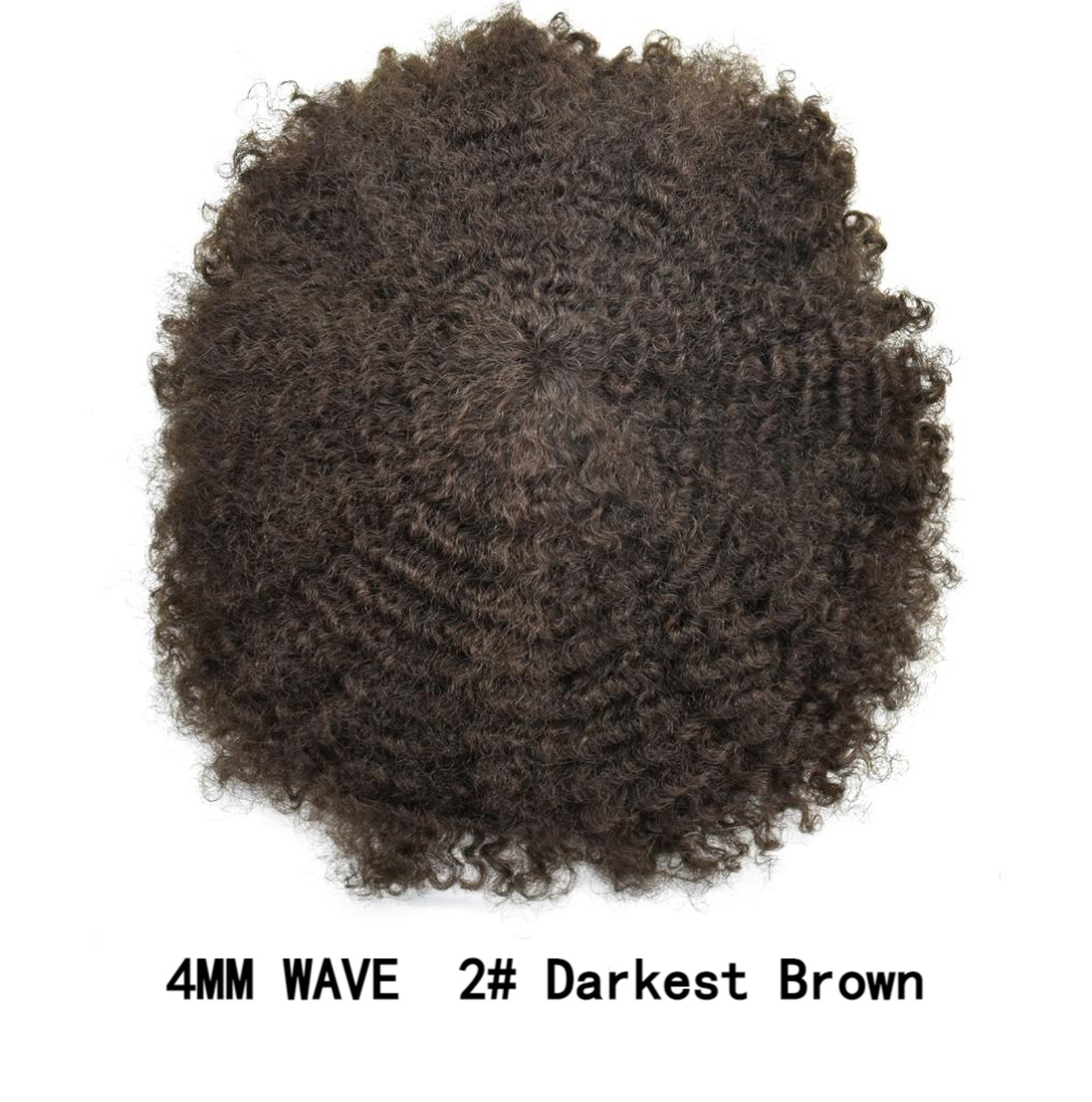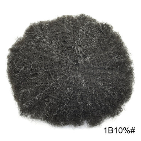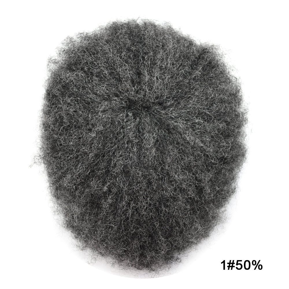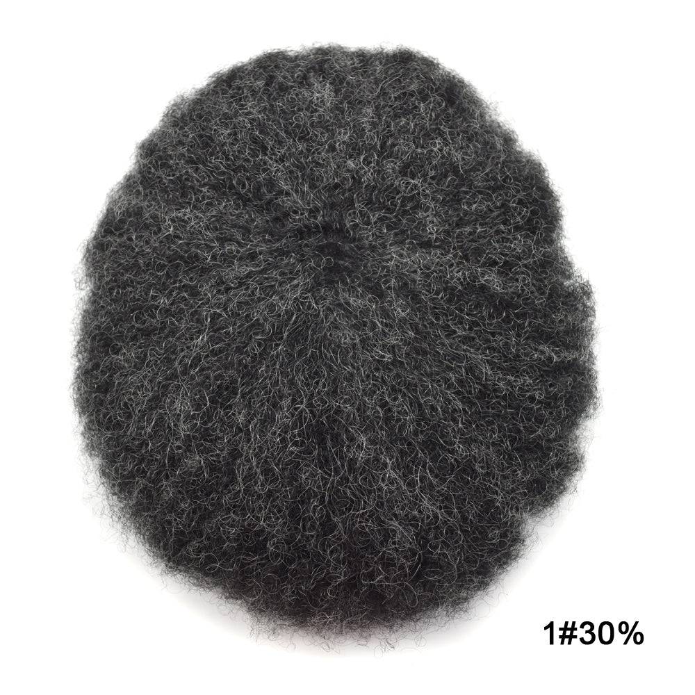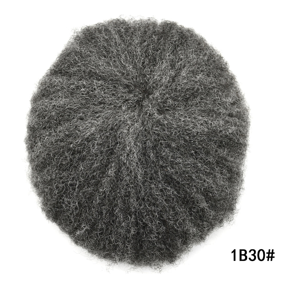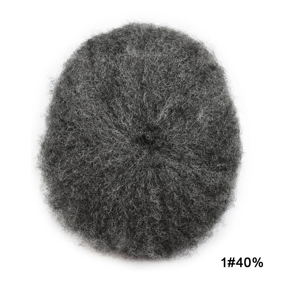 【Afro Hair System Color Density】Afro curly hair piece for black men 4mm 6mm 8mm 10mm 12mm 14mm 16mm 20mm.Mens toupee hair available color:Black,Brown,Ash Grey and Light Blonde.Mens hair toupee white gray hair is synthetic fiber.60RY# is All gray human hair.Afro hair system density is 120% medium light to medium density