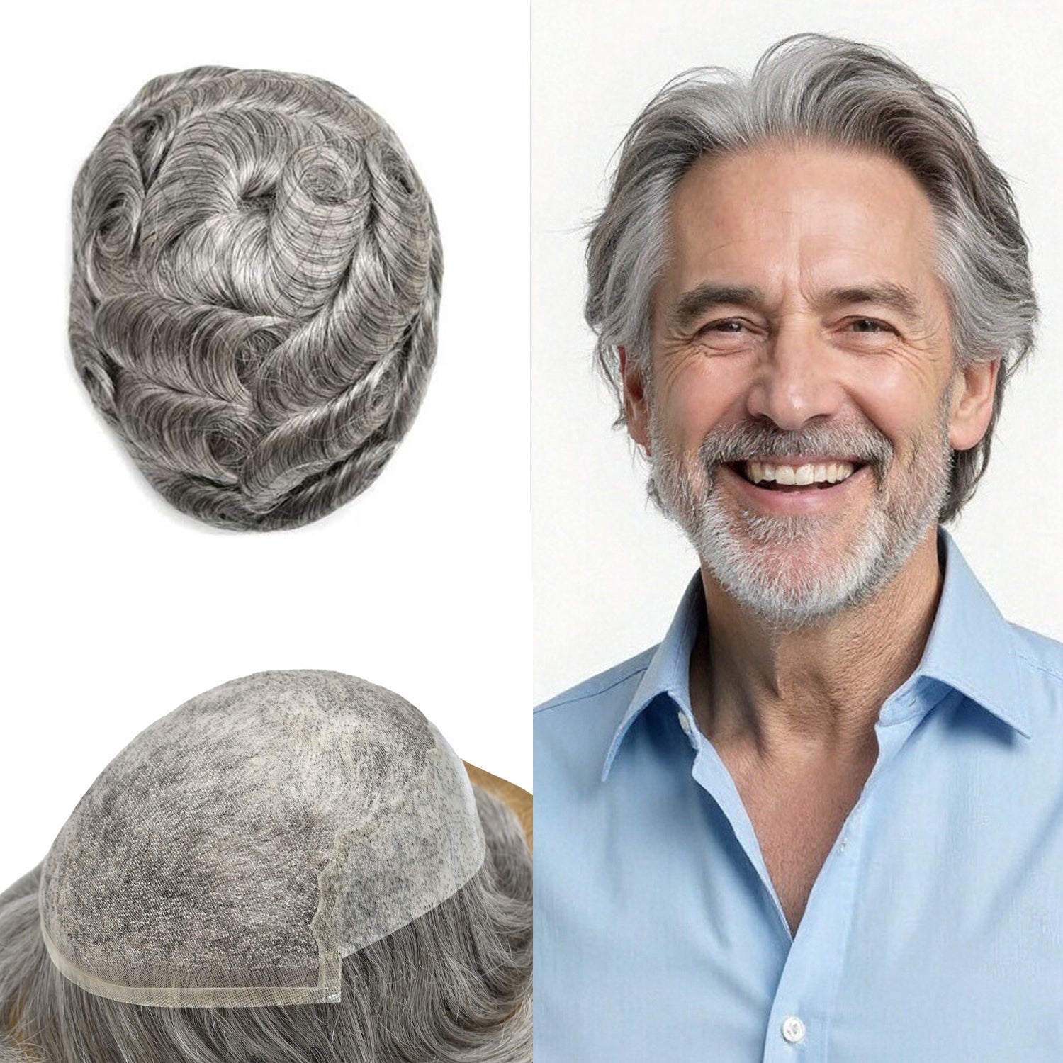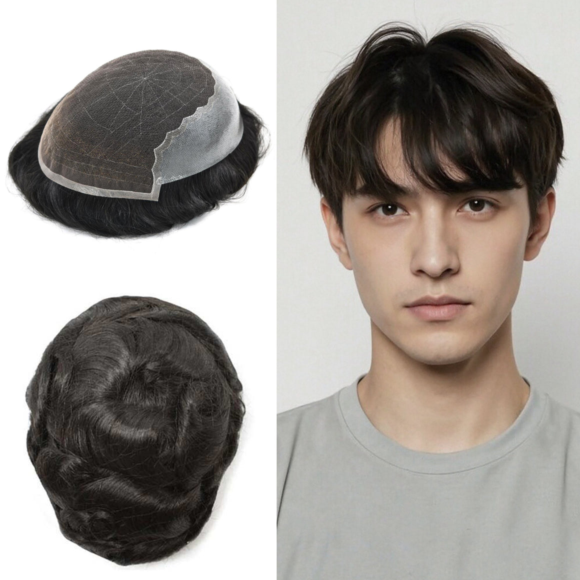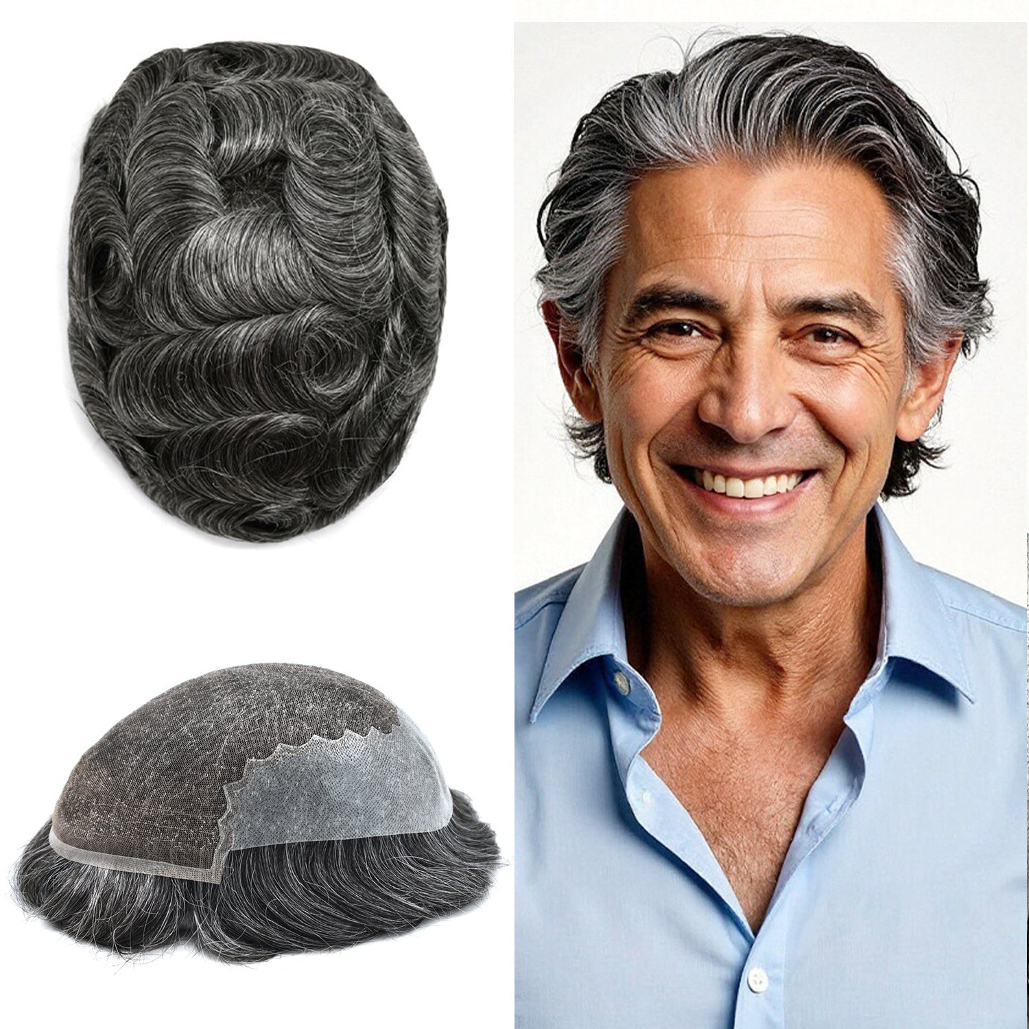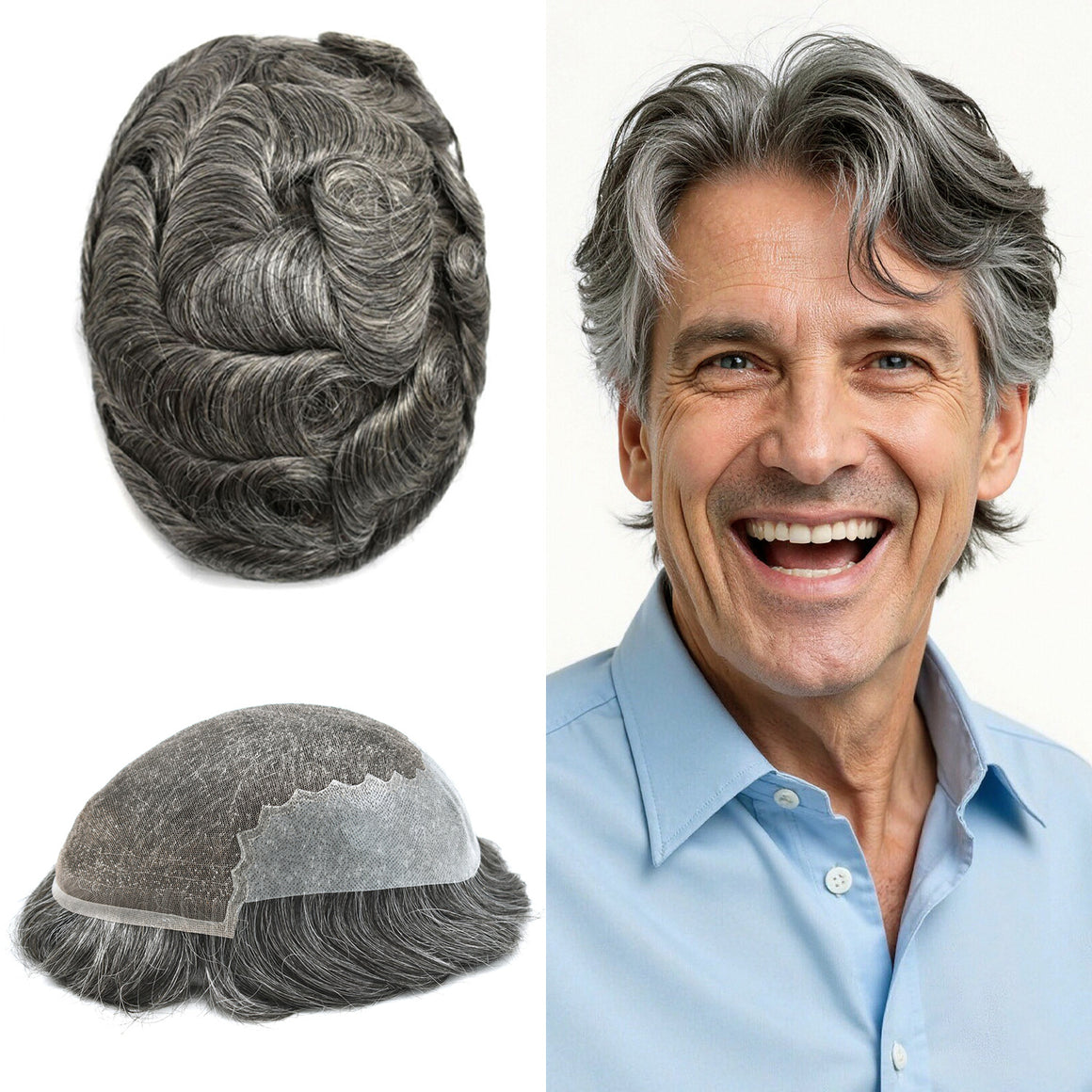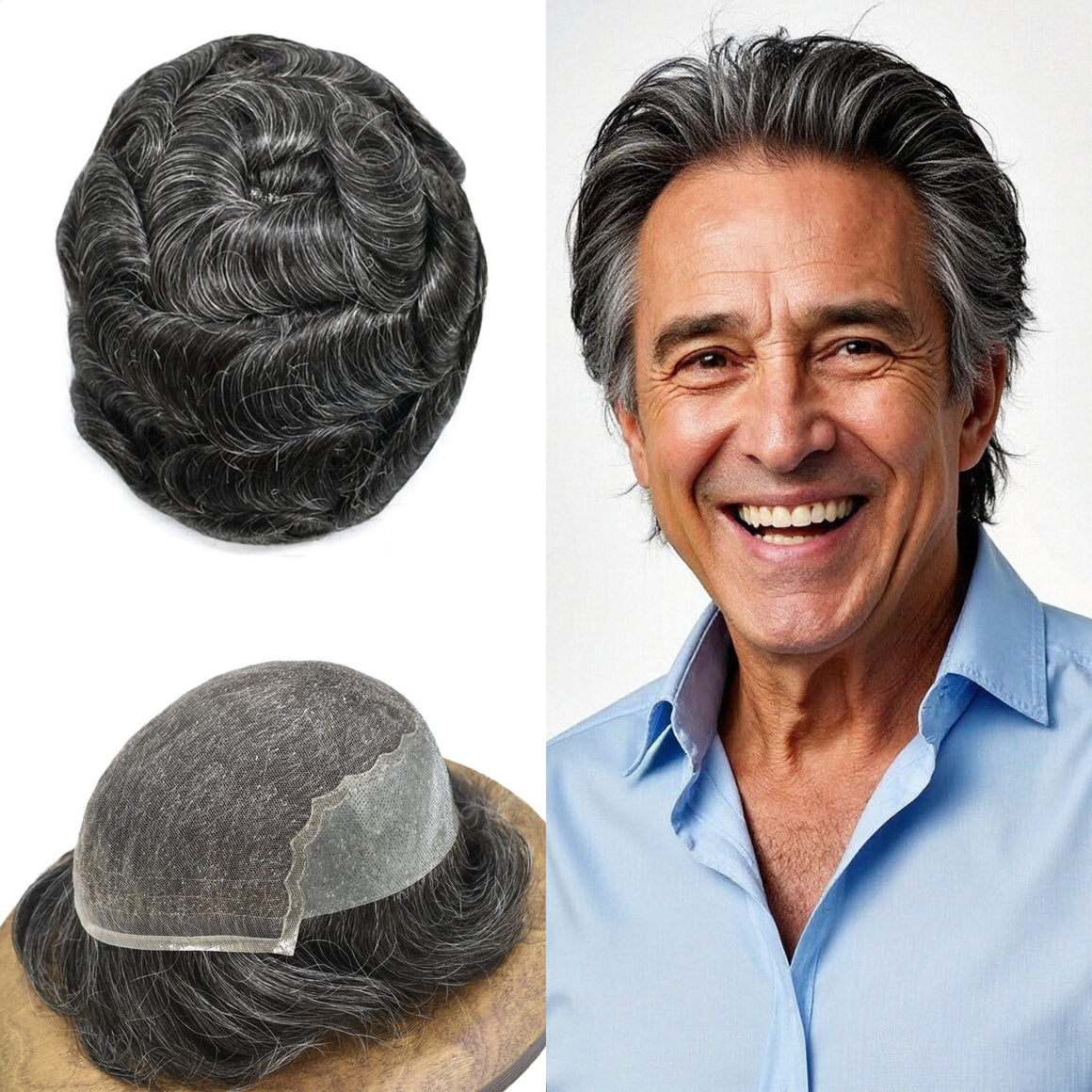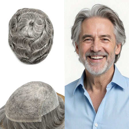 【Hair Color and Density】Hair system for men available hair colors:Black,Brown,Blonde,Ash,and Gray colors.Mens toupee white gray hair is synthetic fiber.60RY# is All gray human hair.Mens toupee density is divided into 80% light density,90% light density,100% light to medium light density, 120% medium light to medium density