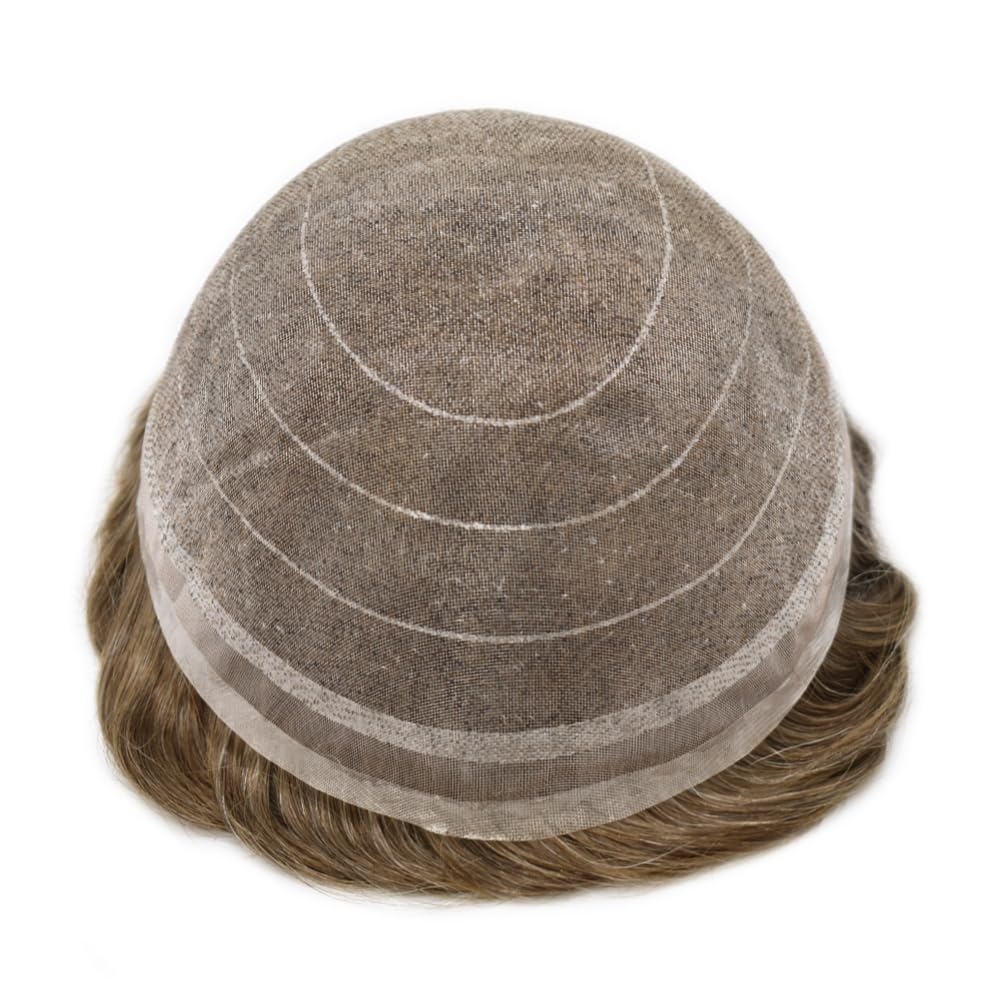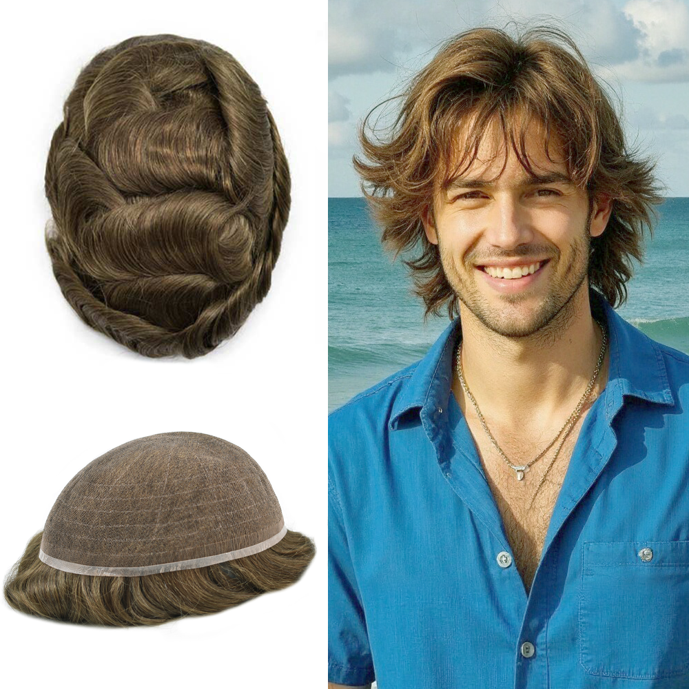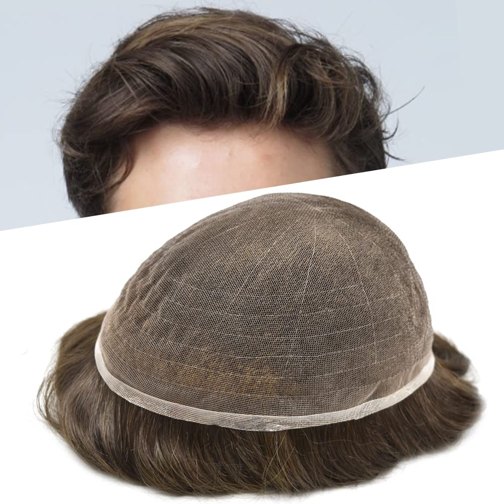Base Design: Crafted with Full Super Thin French Lace, this men's toupee offers a soft, breathable, and ultra-comfortable wearing experience. The knots at the front are bleached to create a realistic, undetectable hairline, giving you full confidence in any situation- Material: This men's hair replacement system is made from Remy Virgin human hair. Each strand is hand-tied individually, ensuring a natural look and feel. With a slight wave pattern and minimal shedding, this toupee mimics real hair perfectly — it’s also easy to trim, style, and maintain.
