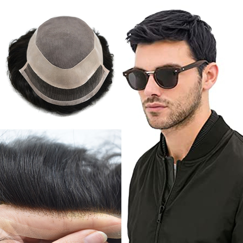 SINGA HAIR Mens Toupee Human Hair Piece Durable Fine Mono Lace Front with Poly NPU Around Natural Wig Hairpieces Human Hair Replacement System for Men